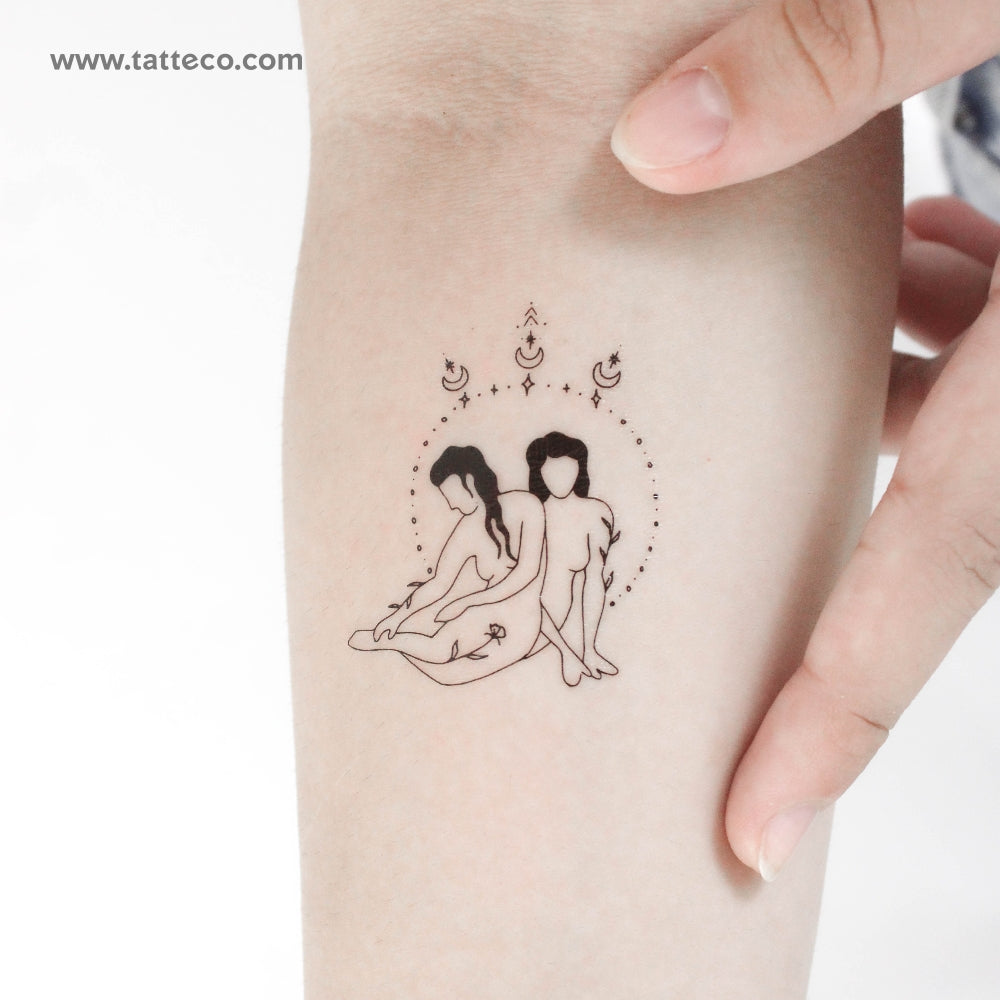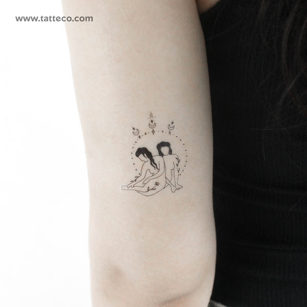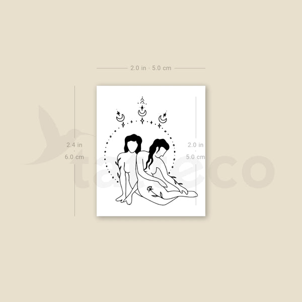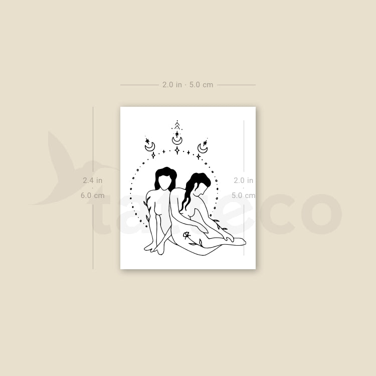 This ecological women temporary tattoo, created in collaboration with Tukoi, is a prime example of her distinct style and use of the female form to create an enchanting design. Our two women fake tattoo shows two faceless women surrounded by the moon. The moon is created from a series of dots, stars, crescent moons, and arrows - embellishments that heighten the meaning of this design.
