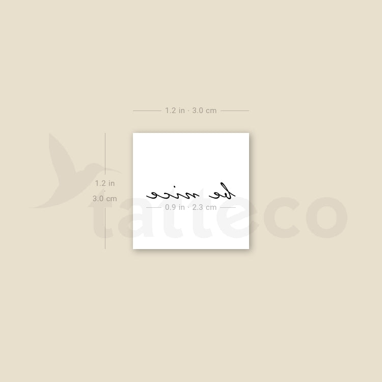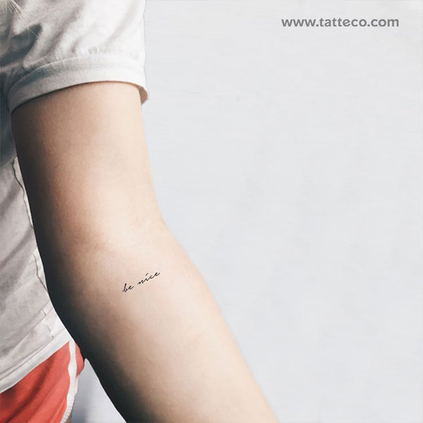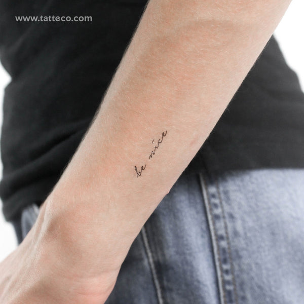Handwritten script 'be nice' temporary tattoo.
