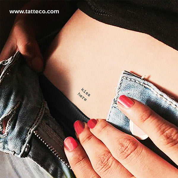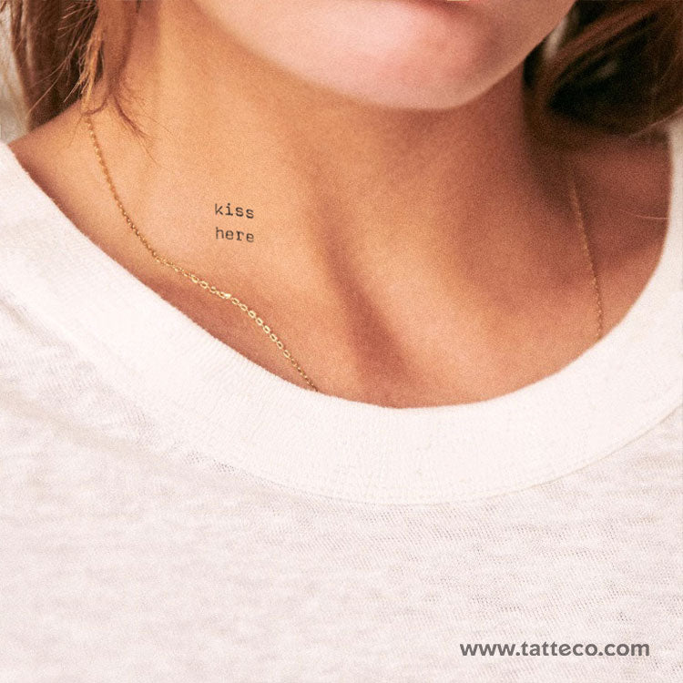 Typewriter font style 'kiss here' temporary tattoo, perfect to spice up your wedding!