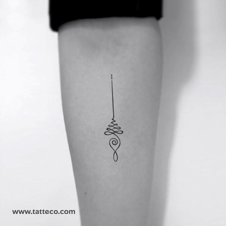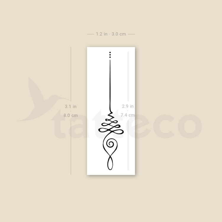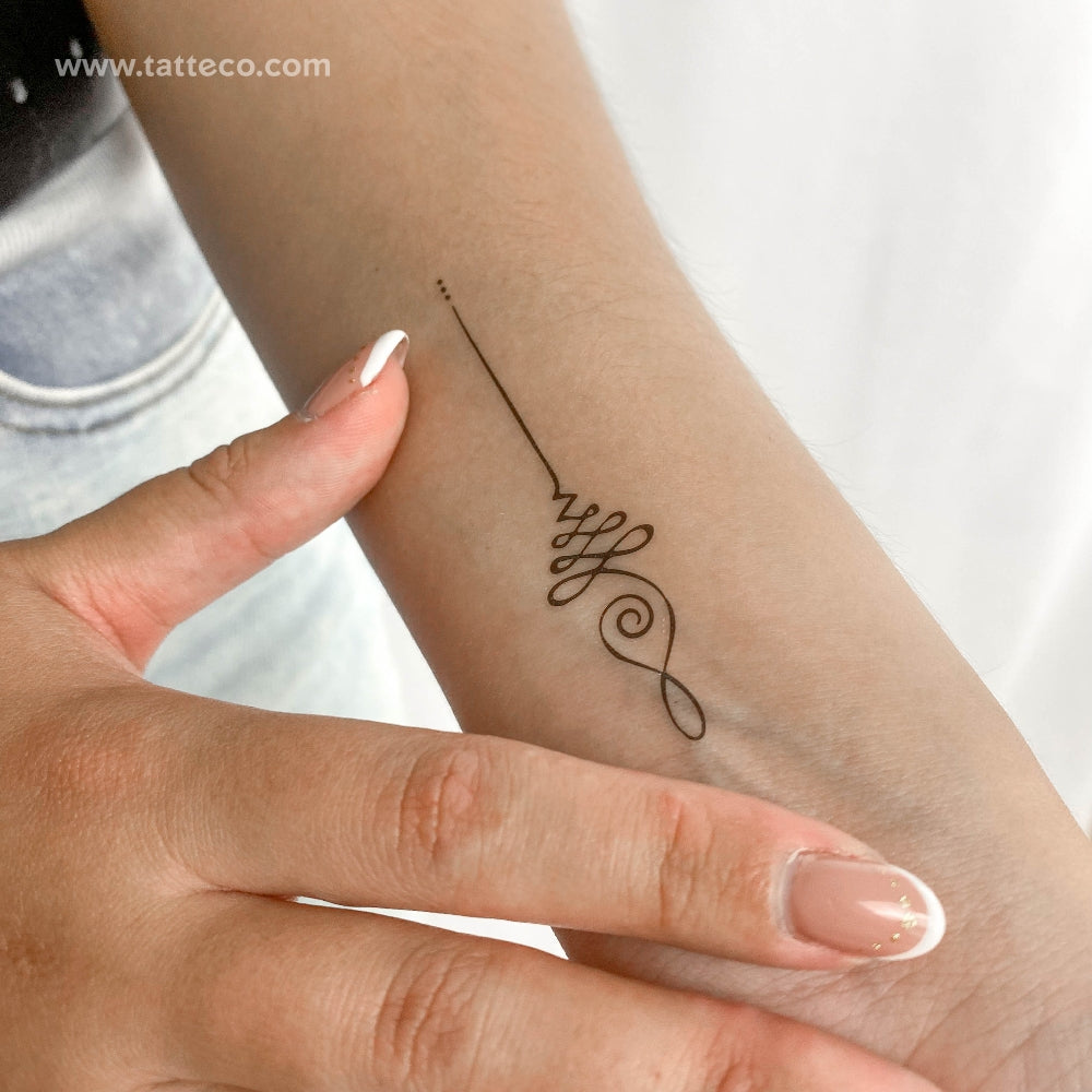 The symbol featured in our eco-friendly Unalome fake tattoo is a sacred design in the Hindu and Buddhist religions. It is a unique design representing one’s journey from birth to enlightenment. It shows the twists and turns we take as we grow and expand spiritually. Eventually, the line straightens out, representing a state of enlightenment. The three dots at the end are often used to represent the end of one’s physical life.