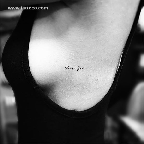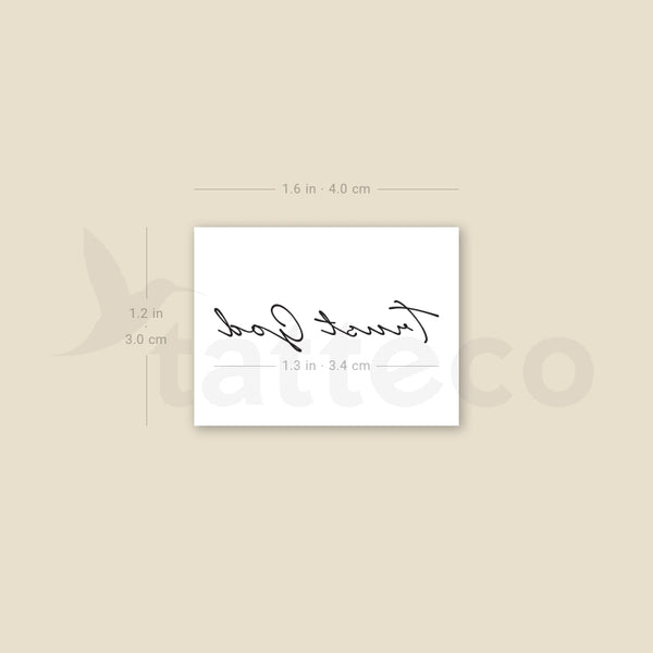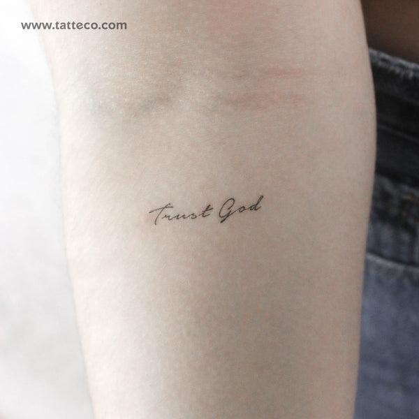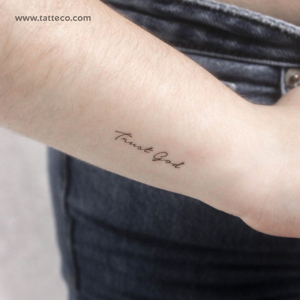Minimalist 'Trust God' handwritten script temporary tattoo.
