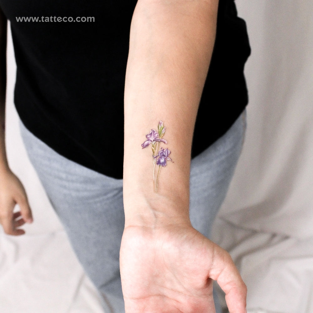 Our illustrative iris temporary tattoo was created in collaboration with Mini Lau, a tattoo artist in Hong Kong who is known for her pastel palette illustrative designs. It depicts three intricate purple irises in different stages of bloom. The fine detail and realistic appearance are a classic hallmark of her illustrative tattoo style.