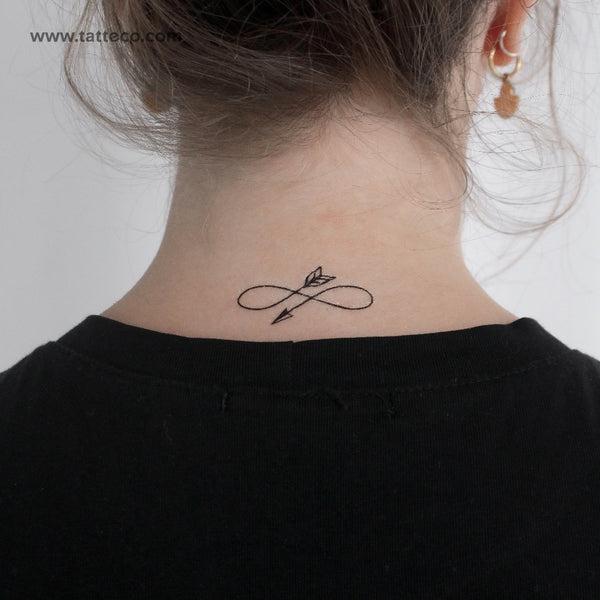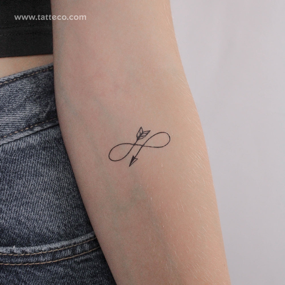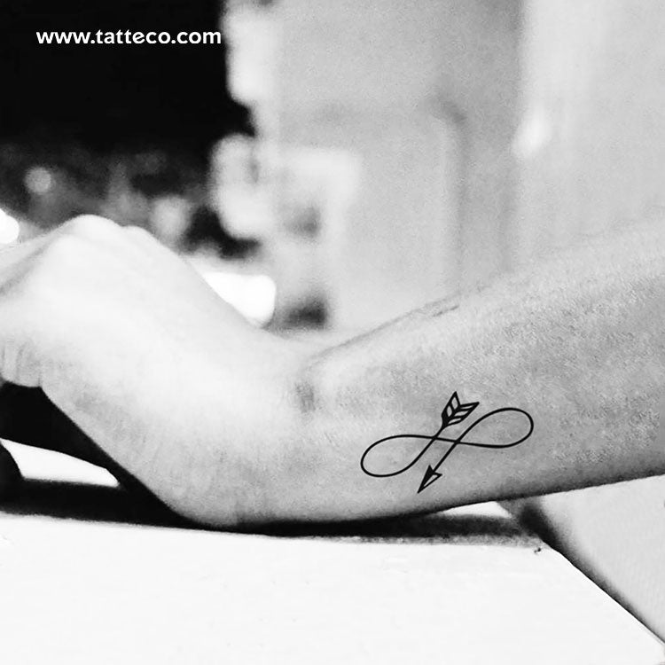 Our infinity arrow temporary tattoo is unique because it incorporates an infinity loop into the design, giving it added meaning. It can be interpreted to mean that there will always be struggles, but you can find a way to triumph over them and achieve peace. The design has a carefree feel to it, almost like an arrow gliding effortlessly through the air.