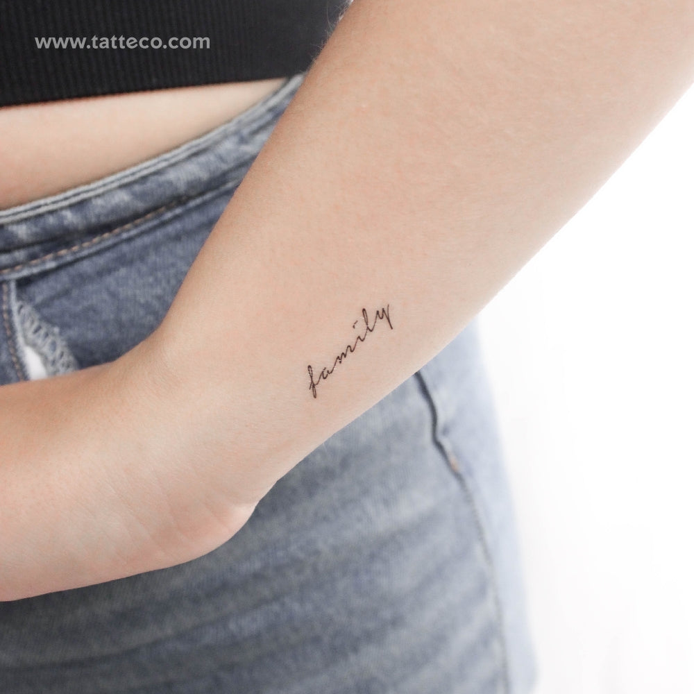 Designed in a handwritten italic cursive font, our family temporary tattoo is the perfect green alternative as it is made with non-toxic materials and comes in 100% packaging. Elegant, sophisticated, and minimalist, the temporary tattoo is the perfect environmentally friendly option for the eco-conscious out there.