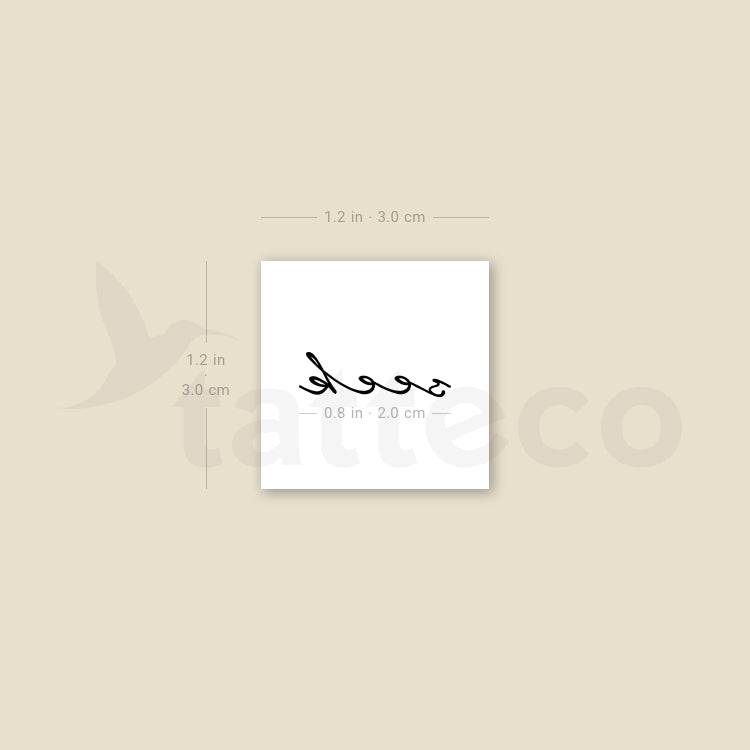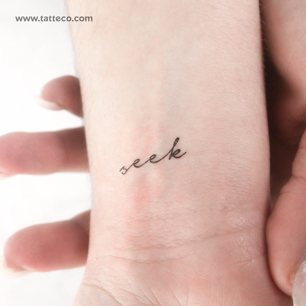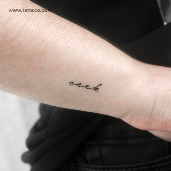 Handwritten script 'seek' temporary tattoo.