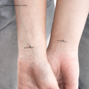 Of course, the word sister does not extend only to sisters within a family. You may feel such a deep and intimate closeness with your friends that they truly feel like sisters to you. Our ‘sister’ adhesive tattoo would be a wonderful way to honor this connection. For some other options, you can check out our ‘sisters’ love temporary tattoo and this matching set of ‘big sis’, ‘little sis’ fake tattoos.