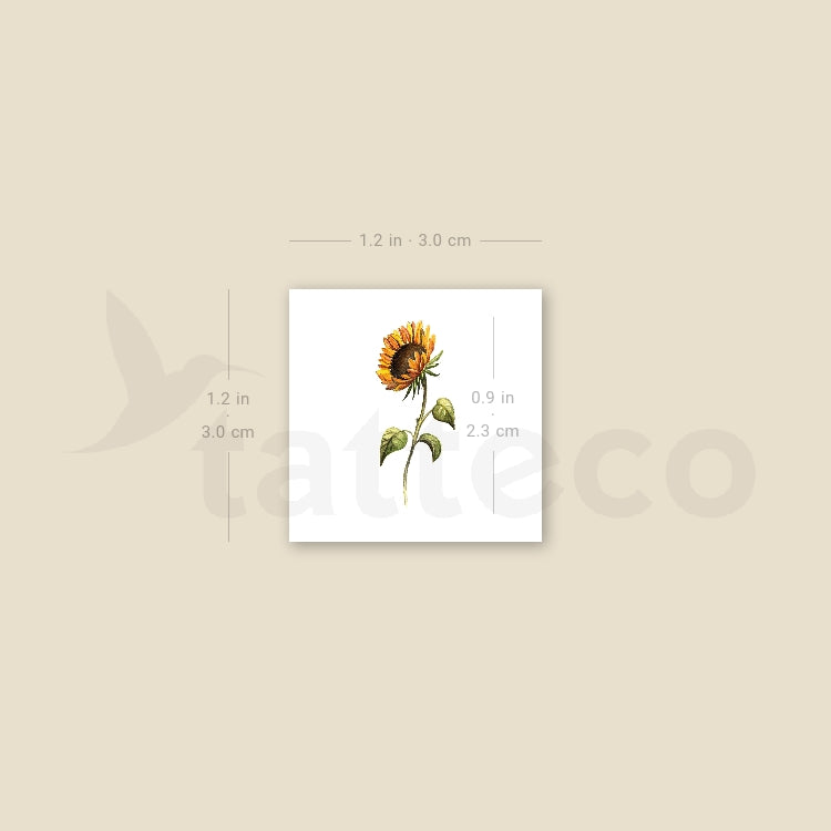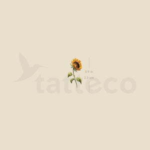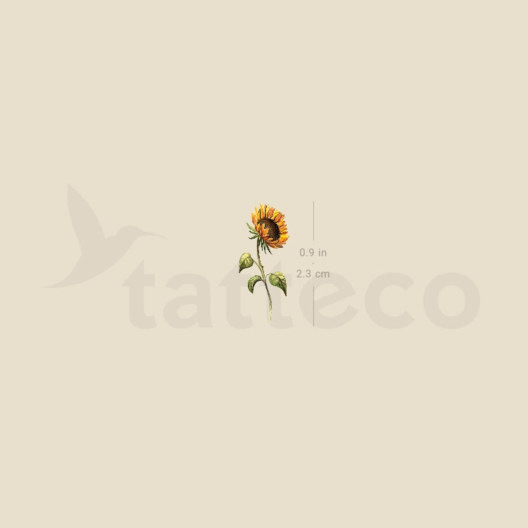Our small sunflower temporary tattoo was created in collaboration with Lena Fedchenko, a talented tattoo artist who is celebrated for her unique watercolor style. This sunflower fake tattoo features a sunflower in full color, with its head tilted towards the sky, and several green leaves on its stalk. It comes in a set of three, so it’s the ideal way to experiment with this design before committing to ink. Not quite what you had in mind? You can explore our full collection of sunflower fake tattoos!