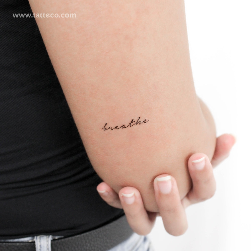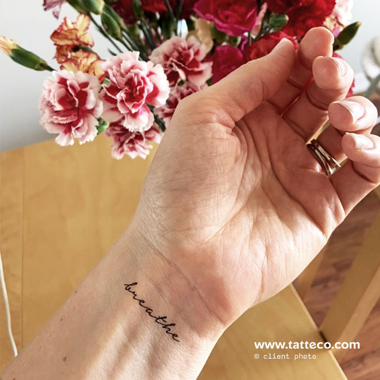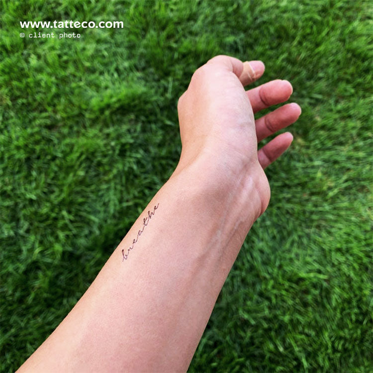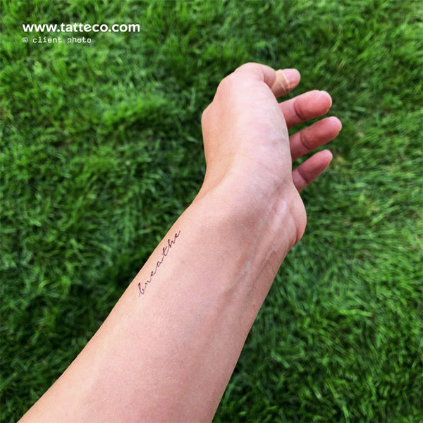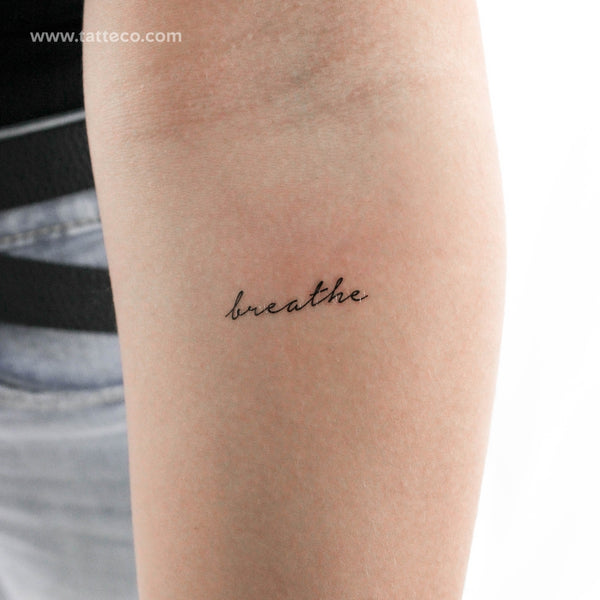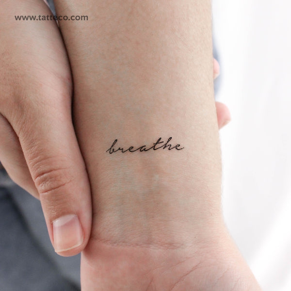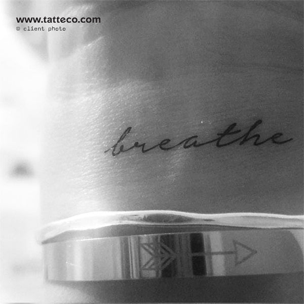 Minimalist 'breathe' handwritten script temporary tattoo.