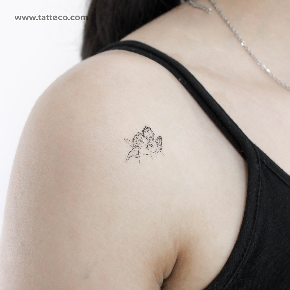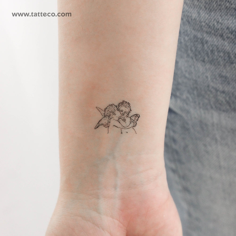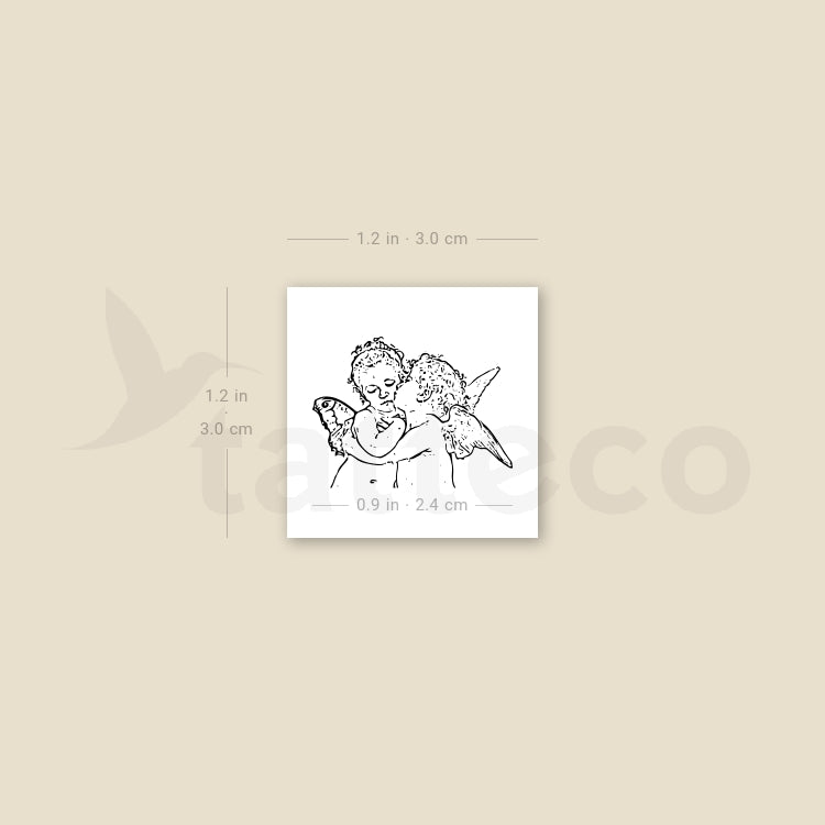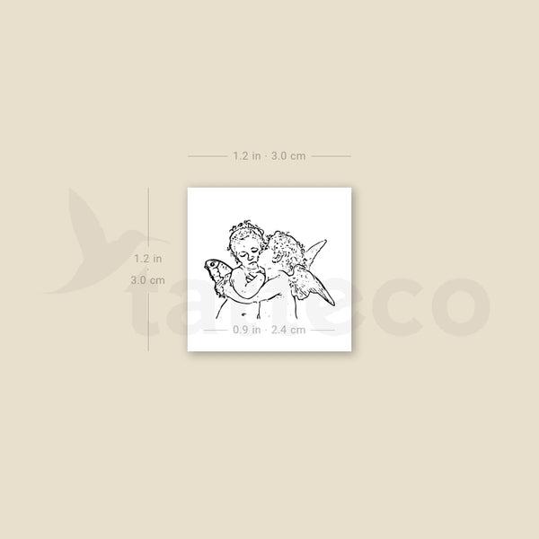 Small fine line style first kiss temporary tattoo. The original artwork is an oil painting by Bouguereau, titled L'Amour et Psyché, enfants.