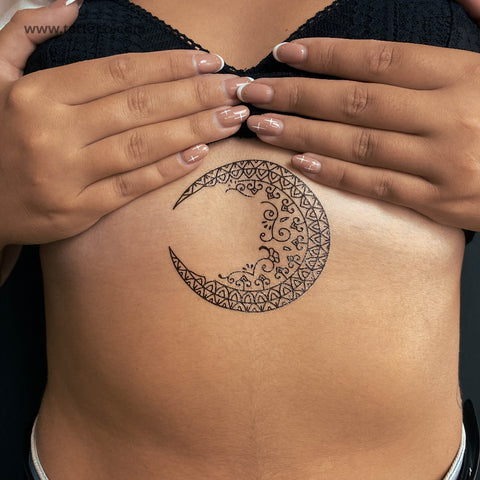 If you’re looking for a special way to capture this energy, you might be interested in our crescent moon face temporary tattoo. In this design, we see an elegant portrayal of a woman’s face in profile, forming one side of a crescent moon. This minimalist interpretation of a crescent moon with a face is perfect for anyone who prefers a simpler fake tattoo design.