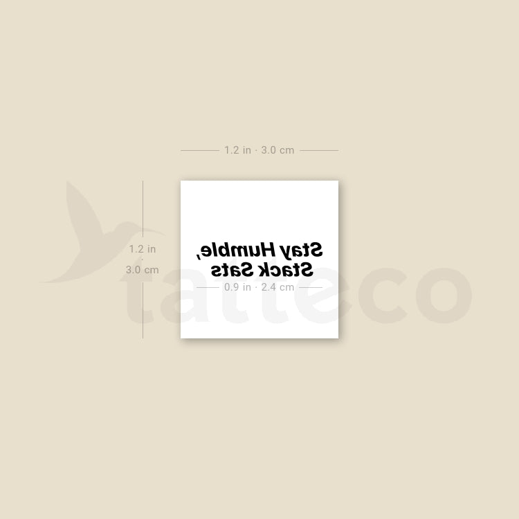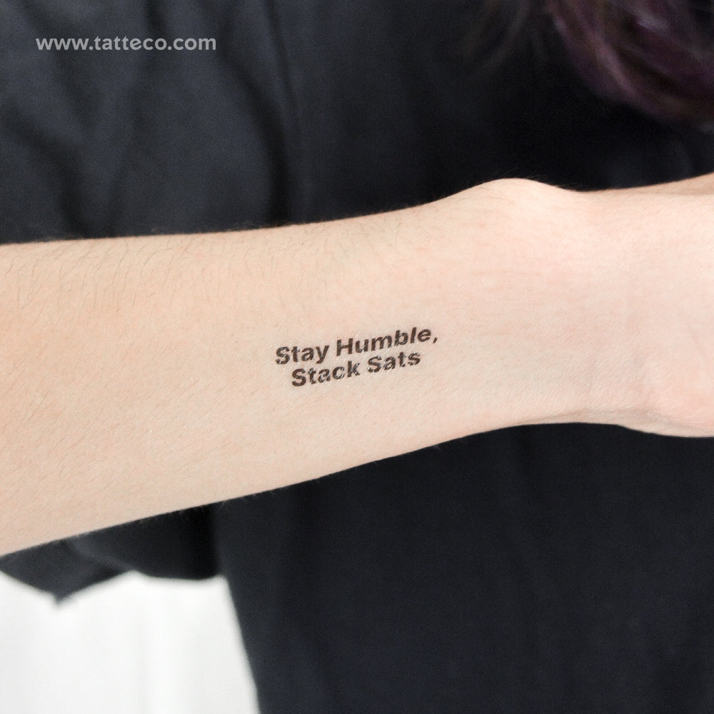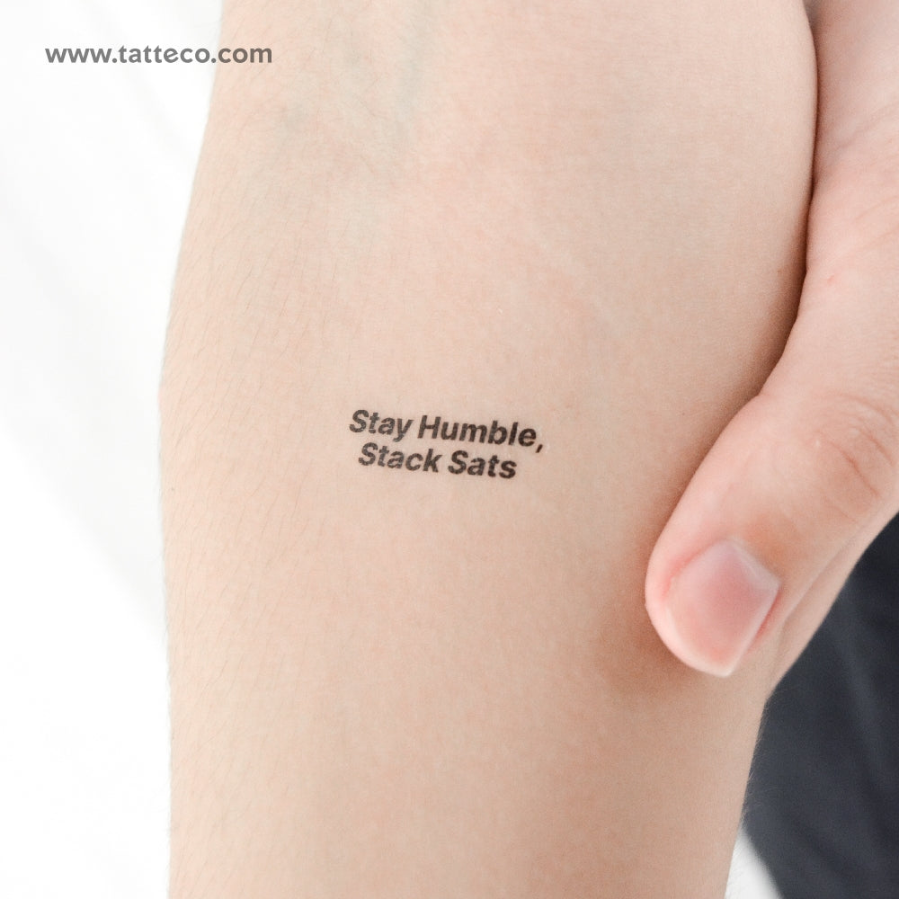 Sans-serif style Stay Humble, Stack Sats temporary tattoo.