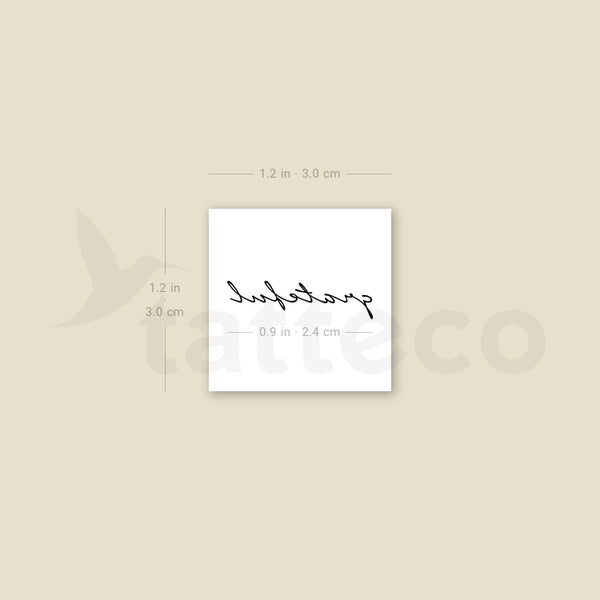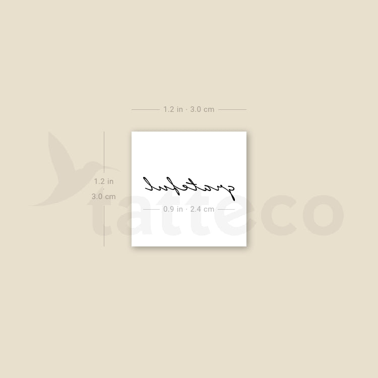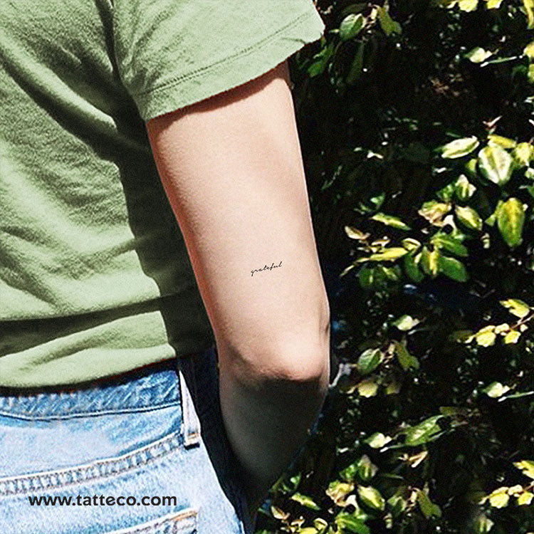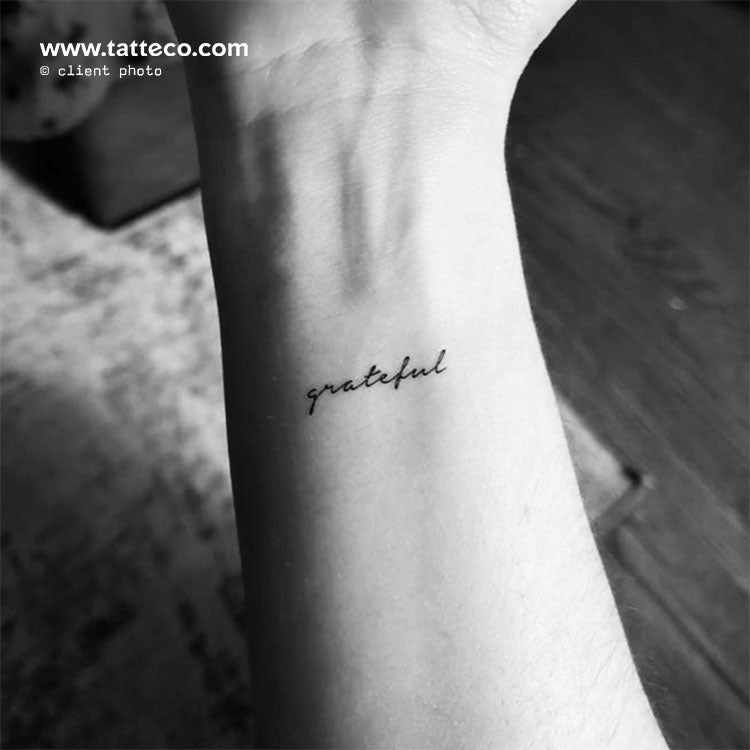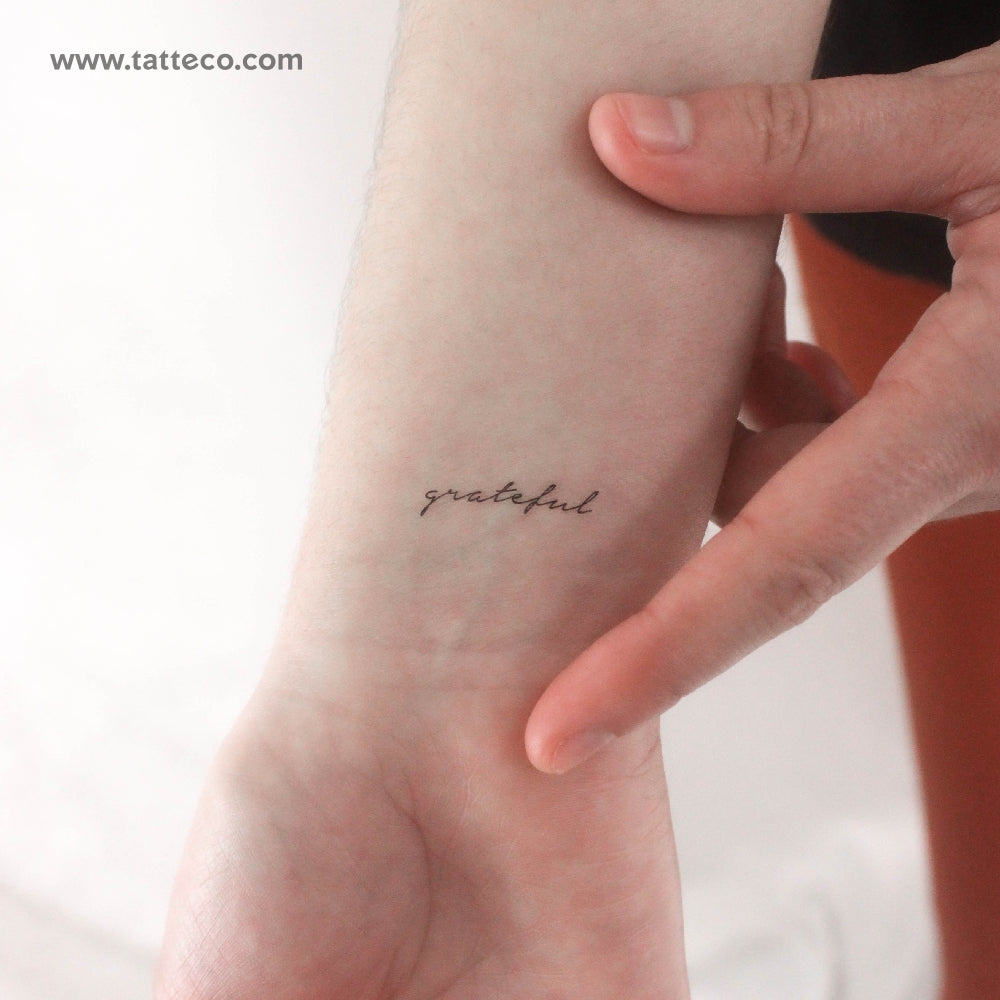 Minimalist 'grateful' handwritten script temporary tattoo.