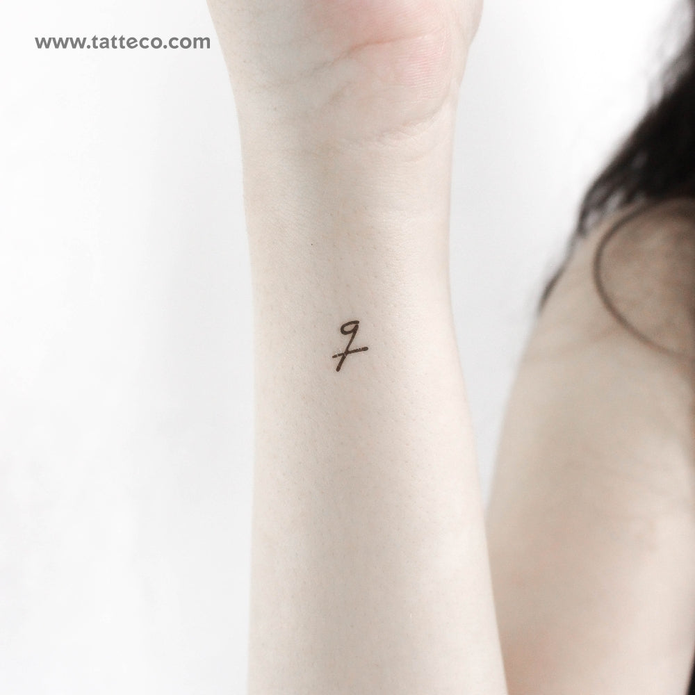 Handwritten lowercase q letter temporary tattoo.