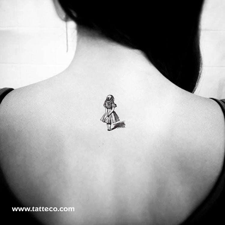 Our Alice in Wonderland temporary tattoo features one of Tenniel’s illustrations, showing Alice standing with arms clasped behind her back, peering into the great unknown. Her innocence, calm, and state of awe are the perfect representation of childhood. Created in the illustrative style, our Alice fake tattoo contains fine lines and intricate details.