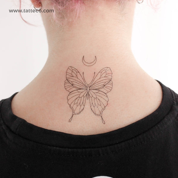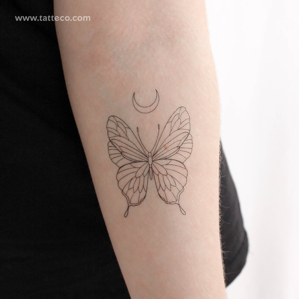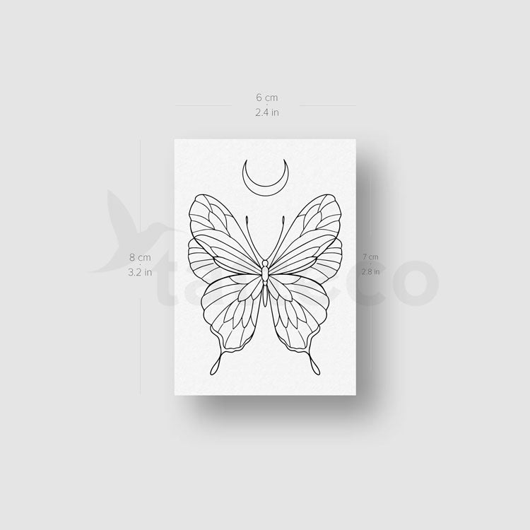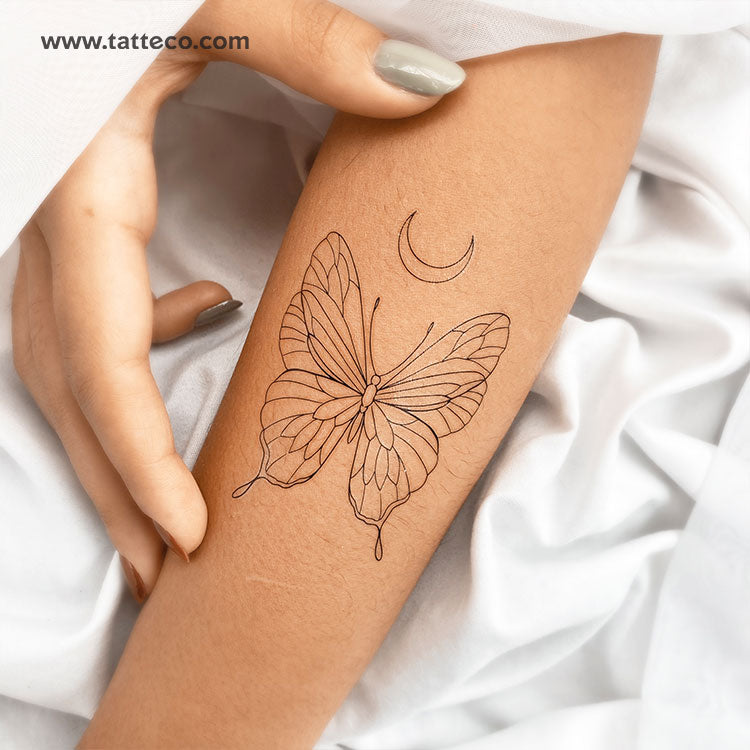 Our fine line butterfly fake tattoo was designed in collaboration with Juan Pedroza Tobar (aka 1991.Ink), a talented tattoo artist from Columbia. This design features an elegant butterfly with its wings spread wide and a crescent moon hovering just above.