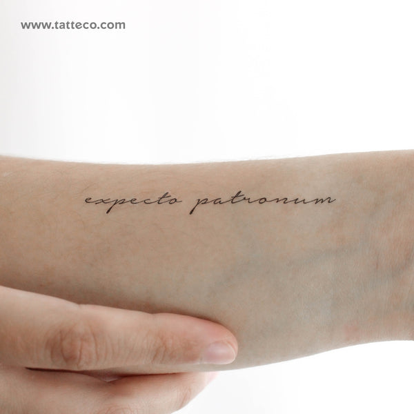 Our ‘expecto patronum’ fake tattoo is designed using a beautiful handwritten script, which will give this design a classic, elegant appearance on your skin. It comes in a set of three, so you can experiment with placements or share one with a friend.