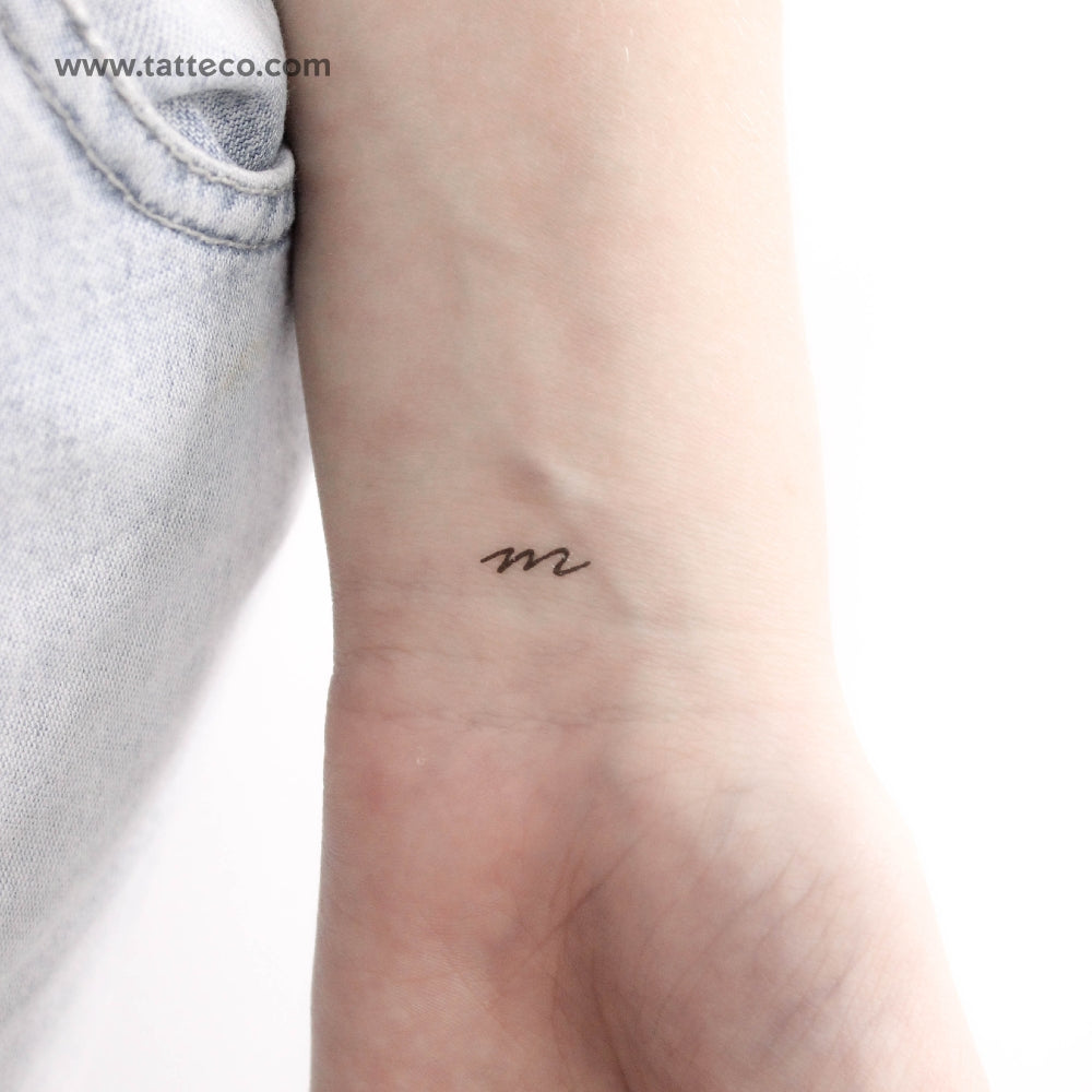 Our ‘m’ handwritten letter temporary tattoo shows a tiny lowercase ‘m’ in a cursive script. Its small size means it can be placed almost anywhere on your body and will have a subtle appearance, even in highly visible areas. We can imagine this tiny m nestled among the fingers, partially concealed behind the ear, or gracing the ankle with its presence.