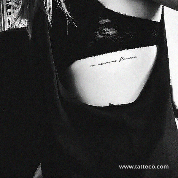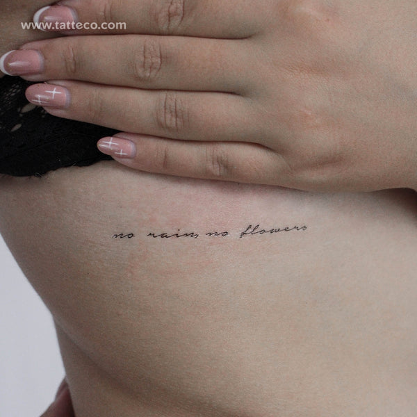 Every single little thing in life depends on balance. We have rain and sun, bad and good, hate and love, and so much more. “No rain no flowers” is the perfect quote to remind us that we need both sides to thrive and coexist. All too often, we choose a side, a side we think is right but, it’s important to remember that without rain, there are no flowers. If you’re trying to find balance in your life and views, our no rain no flowers temporary tattoo could be just what you need.