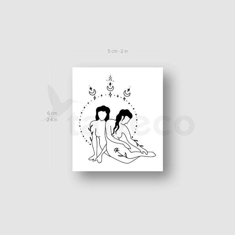 This ecological women temporary tattoo, created in collaboration with Tukoi, is a prime example of her distinct style and use of the female form to create an enchanting design. Our two women fake tattoo shows two faceless women surrounded by the moon. The moon is created from a series of dots, stars, crescent moons, and arrows - embellishments that heighten the meaning of this design.